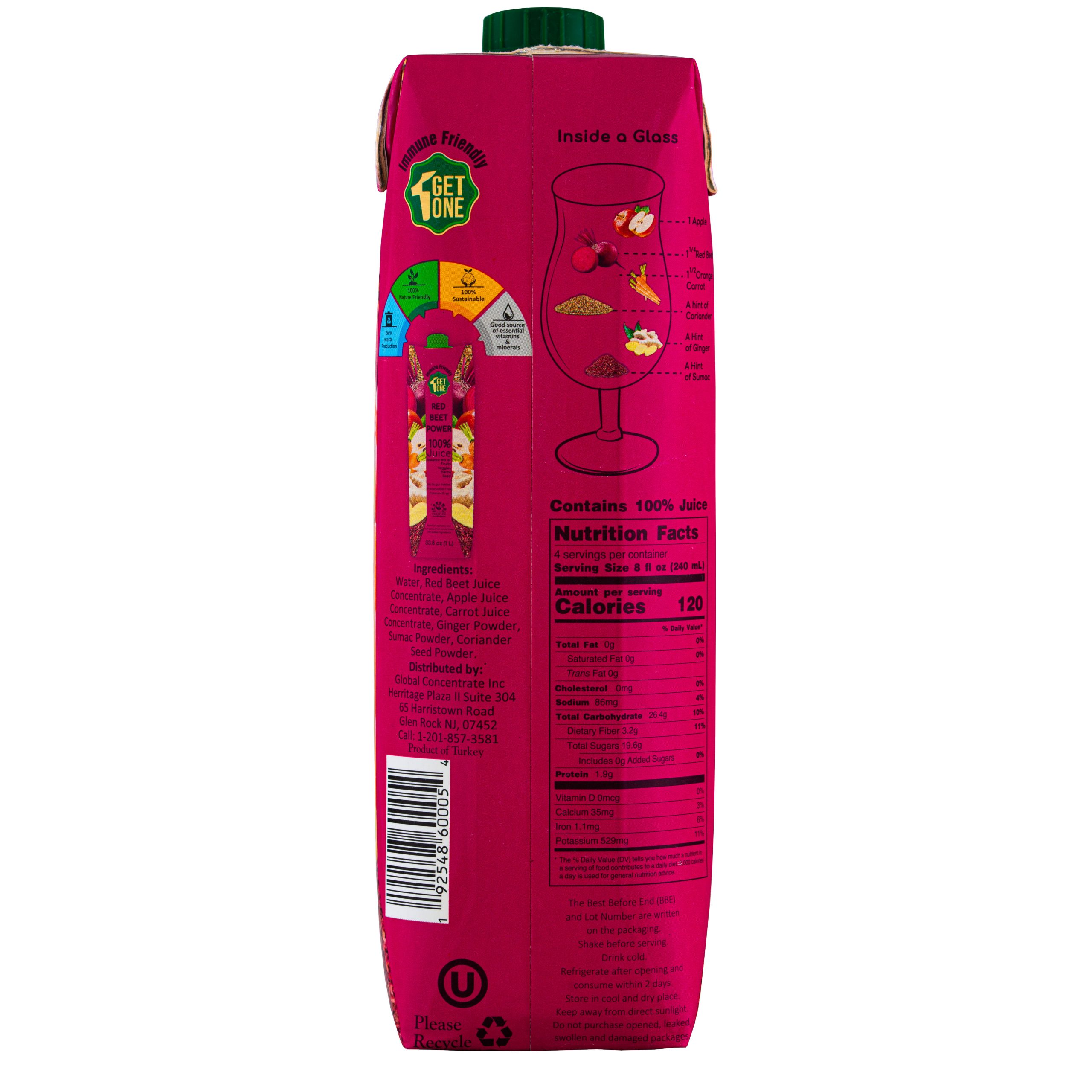 Ingredients: Water, Red Beet Juice Concentrate, Apple Juice Concentrate, Carrot Juice Concentrate, Ginger Powder, Sumac Powder, Coriander Seed Powder.