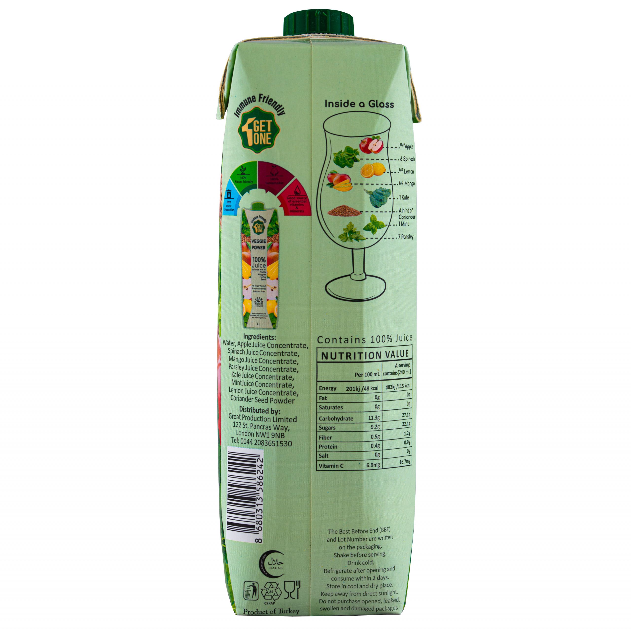 Ingredients: Water, Apple Juice Concentrate, Spinach Juice Concentrate, Mango Juice Concentrate, Parsley Juice Concentrate, Kale Juice Concentrate, MintJuice Concentrate, Lemon Juice Concentrate, Coriander Seed Powder